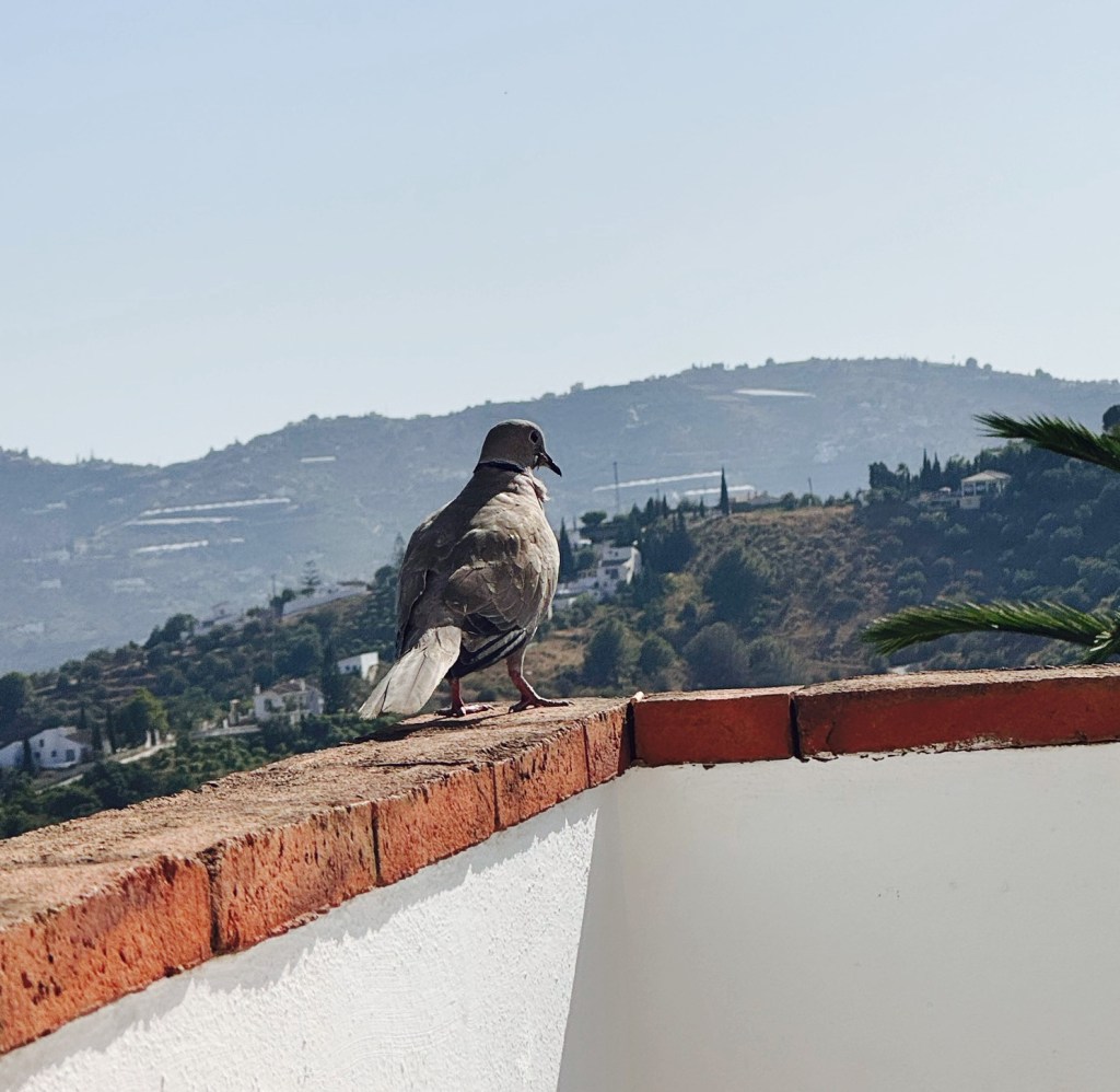 Vandaag had ik bezoek van een duif. Gewoon op mijn balkon. Ik zat rustig een boek te lezen en daar zat zij ineens. Op de stenen rand van het balkon van het appartement in Frigiliana waar ik tien dagen in mijn eentje op vakantie ben. Tot vandaag heb ik hier in Spanje nog geen duif gezien.